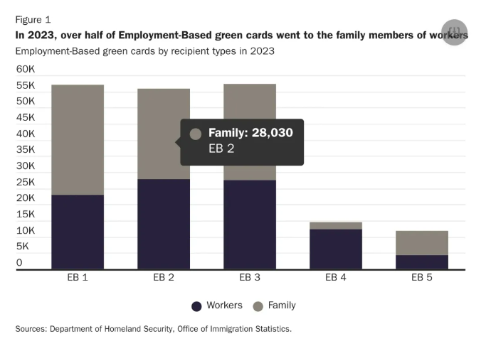 根據(jù)2023年美國(guó)職業(yè)移民綠卡分配的情況統(tǒng)計(jì),大部分綠卡名額其實(shí)都簽發(fā)給了主申請(qǐng)人的配偶、子女,真正簽發(fā)給職業(yè)移民主申請(qǐng)人的綠卡連一半都不到。