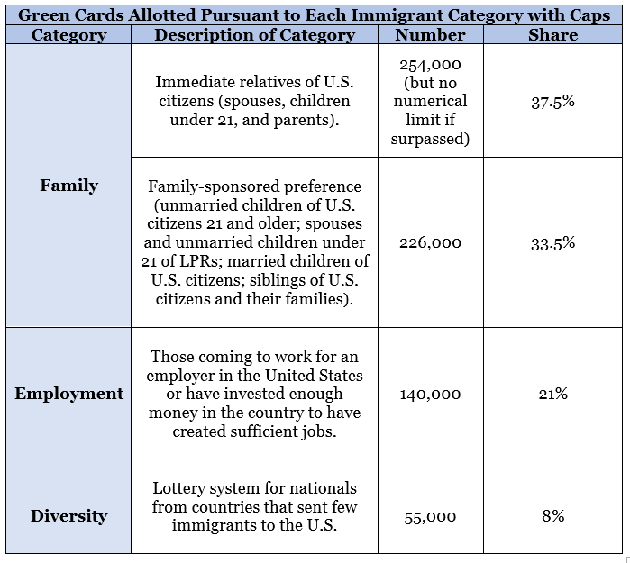 根據(jù)《移民與國(guó)籍法》規(guī)定,每年發(fā)放的各類(lèi)基于就業(yè)的優(yōu)先移民簽證有數(shù)量上的限制,通過(guò)優(yōu)先系統(tǒng)分配的親屬移民綠卡數(shù)量不得低于22.6萬(wàn)張,而分給職業(yè)移民的簽證配額僅有14萬(wàn)張。