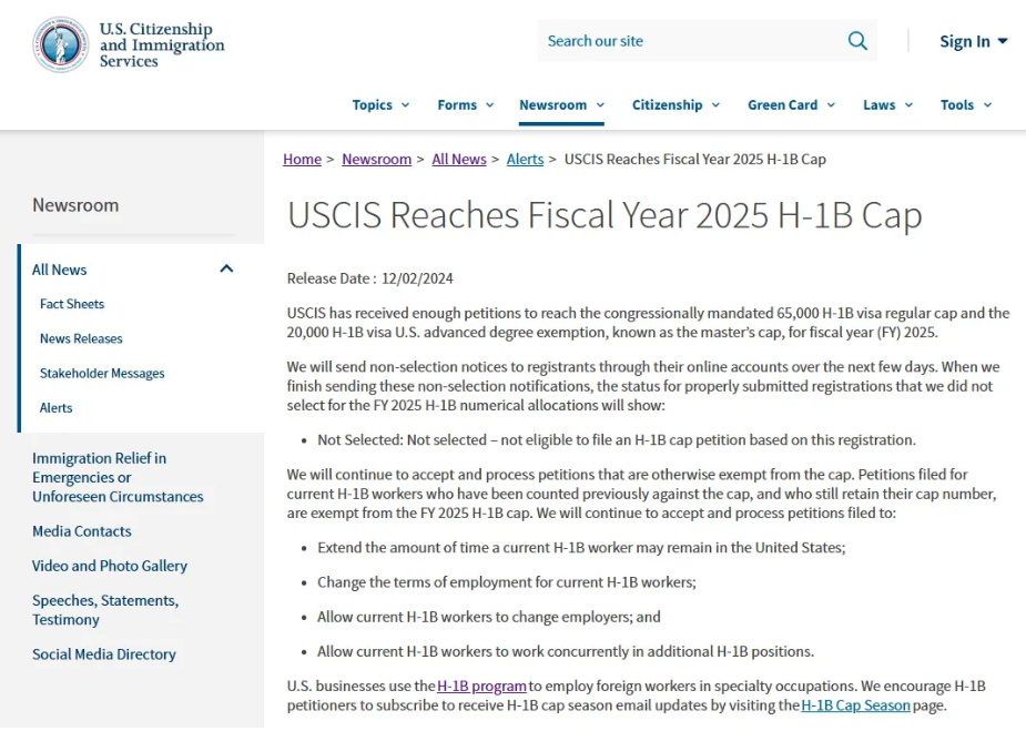 美國當?shù)貢r間2024年12月2日,移民局正式公告,2025財年的H-1B抽簽流程已全部結(jié)束,不會再進行第三輪補抽。