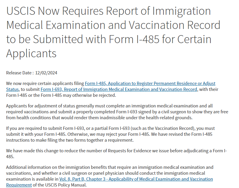 *移民局更新I-693政策公告:https://www.uscis.gov/newsroom/alerts/uscis-now-requires-report-of-immigration-medical-examination-and-vaccination-record-to-be-submitted