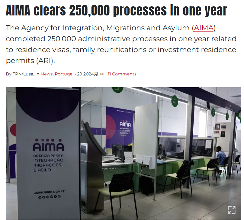 據(jù)葡萄牙權(quán)威媒體 The Portugal News 報道,新移民局 AIMA 成立一年以來,已成功處理 250,000 例申請案例,涵蓋居留簽證、家庭團(tuán)聚和投資居留許可(黃金簽證)等各類業(yè)務(wù)。這一數(shù)據(jù)充分彰顯了移民局的積極作為和高效執(zhí)行力。