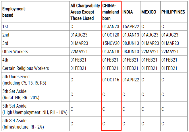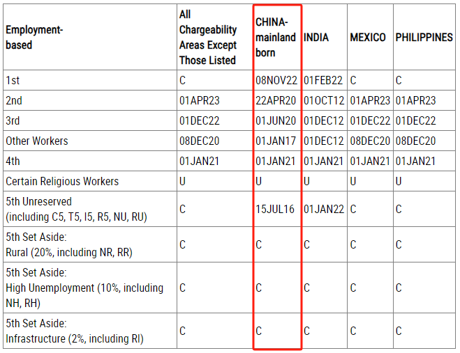 根據(jù)最新排期表,中國大陸出生申請人職業(yè)移民表A(Final Action Date):