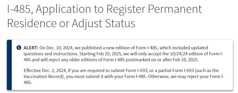 自2025年2月10日起,美國移民局僅接受新版I-485表格(日期為2024年10月24 日)。在此日期之后,使用舊版I-485提交的任何申請都將會被拒絕。