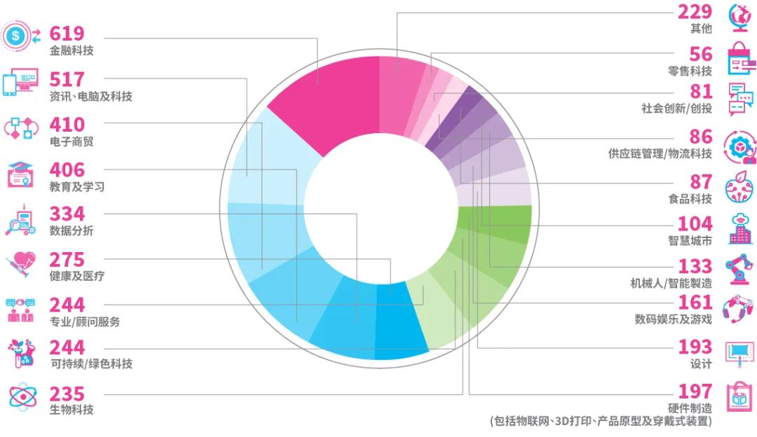 這些初創(chuàng)企業(yè)涵蓋不同行業(yè),包括金融科技;資訊、電腦及科技;電子商貿(mào);教育及學習;以及數(shù)據(jù)分析等。值得一提的是,健康及醫(yī)療,以及可持續(xù)/綠色科技兩個行業(yè)錄得明顯增幅,分別按年增加54%和82%。