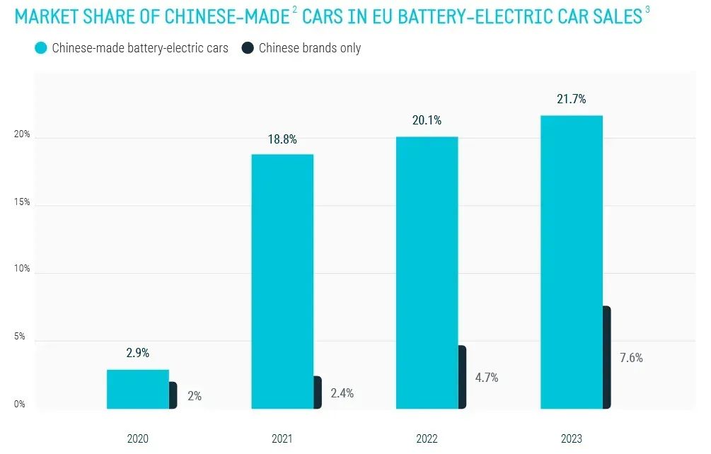過去三年,中國國產(chǎn)汽車在歐盟純電動汽車市場的份額從2.9%攀升至21.7%,其中中國品牌約占這一市場份額的8%。