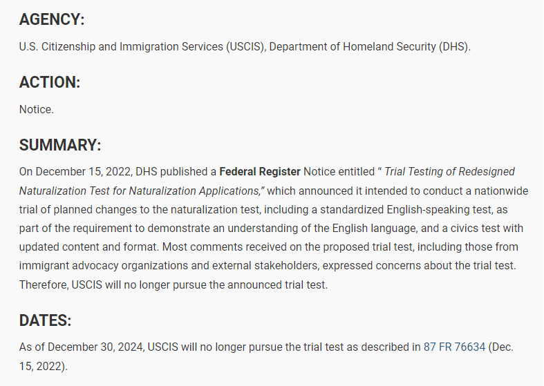 *移民局《聯(lián)邦公告》鏈接:https://www.federalregister.gov/documents/2024/12/30/2024-30213/termination-of-trial-testing-of-redesigned-naturalization-test-for-naturalization-applications