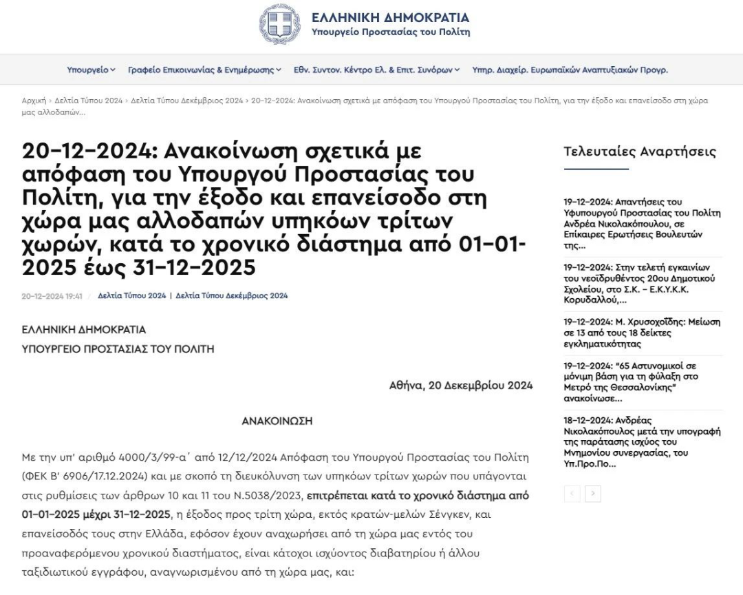 這項(xiàng)希臘公民保護(hù)部部長級(jí)決定編號(hào)為4000/3/99-α?,簽署日期為2024年12月12日,并于2024年12月20日在政府公報(bào)登載發(fā)布。