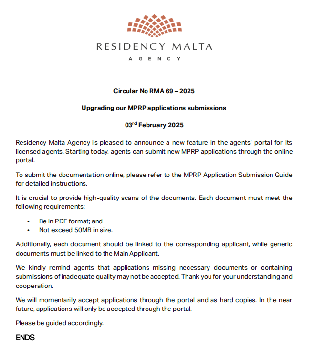 2025年2月3日,馬耳他身份局發(fā)布官方通告,宣布為其持牌代理提供了一項新功能,代理人可以通過在線門戶網(wǎng)站提交新的MPRP申請,線上遞交申請門戶正式啟用。