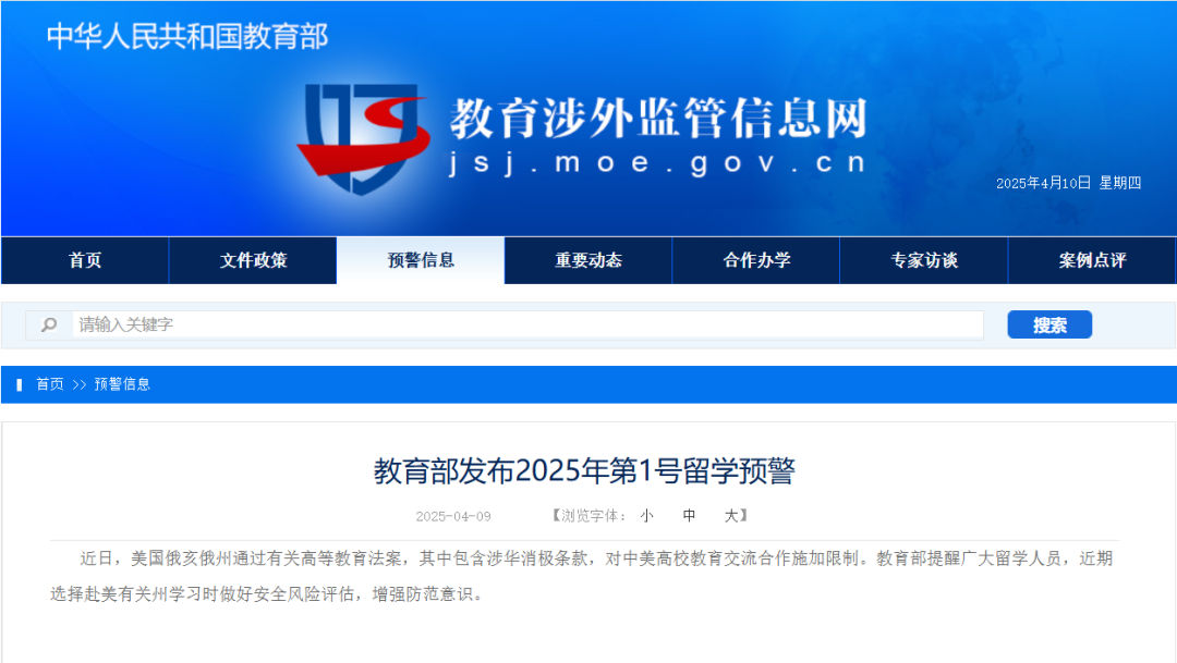 4月9日,教育部發(fā)布2025年第1號(hào)留學(xué)預(yù)警!