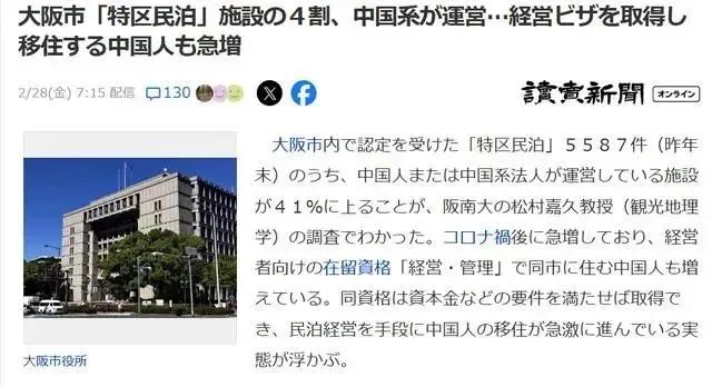 據(jù)《讀賣新聞》報(bào)道,截至2024年末,大阪市共有5,587家“特區(qū)民宿”,其中中國(guó)人或中國(guó)系法人經(jīng)營(yíng)的設(shè)施有2,305家,占比高達(dá)41%。