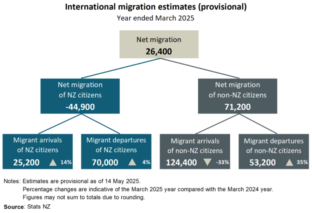 據(jù)新西蘭統(tǒng)計(jì)局(Stats NZ)最新數(shù)據(jù),截至2025年3月的一年中,凈移民人數(shù)為26,400人,較2024年同期的100,400人減少了約74%,也低于2023年同期的74,466人。