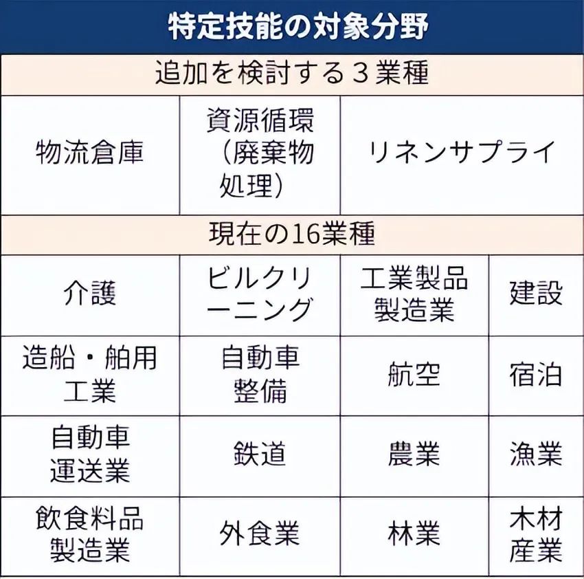 隨著新領域納入,「特定技能」簽證所涵蓋的行業(yè)將由原本的16個擴展至19個,進一步覆蓋日本社會運行的“底層支撐型”行業(yè)。
