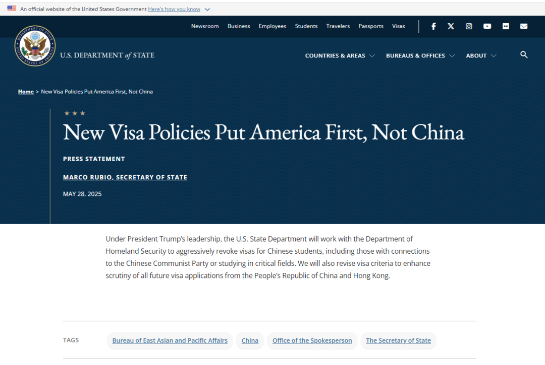同日,美國國務(wù)院網(wǎng)站發(fā)布題為“新簽證政策優(yōu)先考慮美國,而非中國”的聲明。