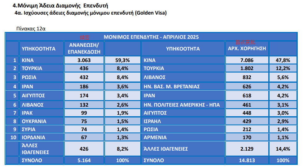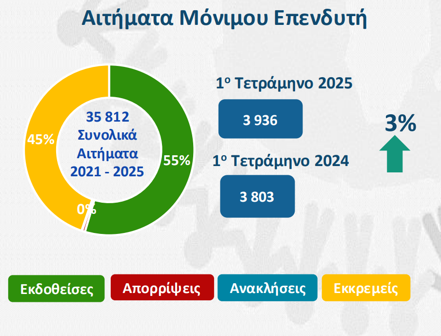 近日,希臘移民局公布了截至2025年4月的黃金簽證數(shù)據(jù)情況:希臘投資者居留許可申請量比去年同期上漲3%,永居卡簽發(fā)量上漲44%。