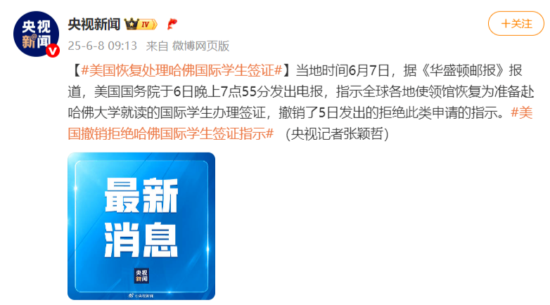 據(jù)報(bào)道,美國國務(wù)院6日19時(shí)55分發(fā)出的電報(bào)稱,“現(xiàn)在,領(lǐng)事部門必須恢復(fù)處理哈佛大學(xué)的學(xué)生和交流訪問者簽證。”