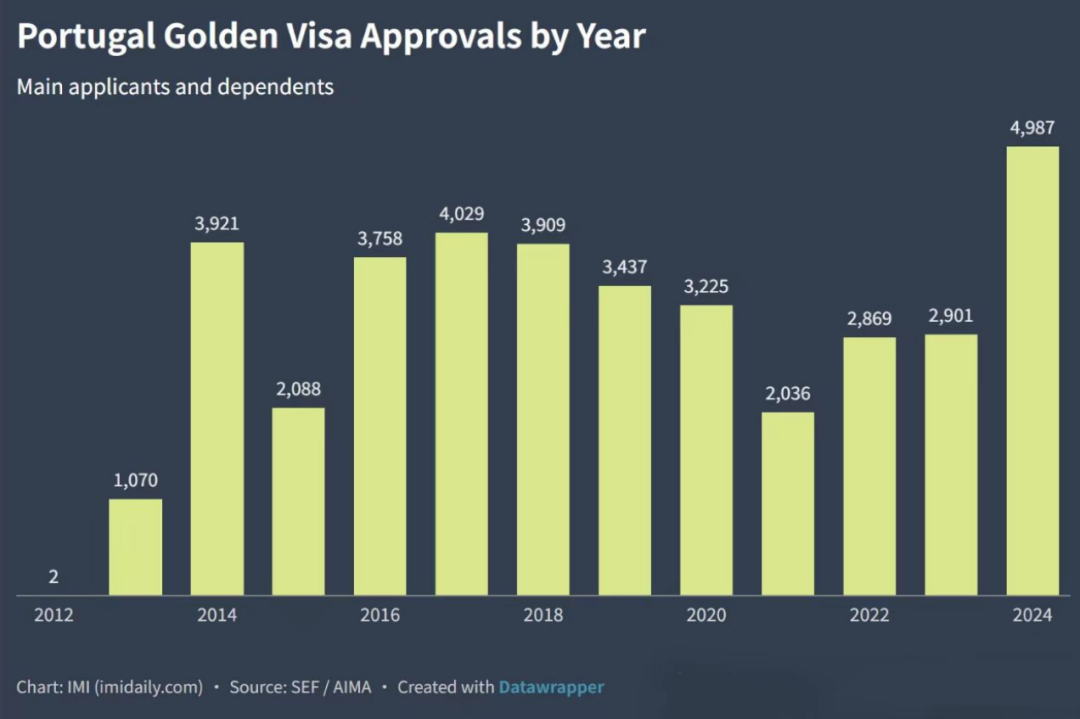 在歐洲多個(gè)國(guó)家陸續(xù)關(guān)停投資居留項(xiàng)目的大背景下,葡萄牙卻走出了一條完全不同的路線(xiàn)。2024年,葡萄牙黃金簽證項(xiàng)目創(chuàng)下歷史新高:全年共批準(zhǔn)4,987份申請(qǐng)(含主申請(qǐng)人及家屬),同比增長(zhǎng)超過(guò)70%,打破了該項(xiàng)目自2012年啟動(dòng)以來(lái)的記錄。