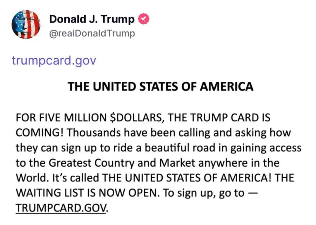 其實(shí)早在今年2月25日,特朗普就已在白宮向媒體透露了他出售定價(jià)500萬美元美國(guó) “金卡” 的計(jì)劃,目標(biāo)瞄準(zhǔn)富有的移民群體。