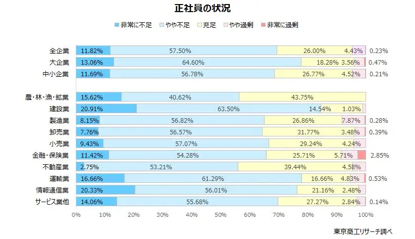 約69.3%的企業(yè)正式社員數(shù)量不足。大企業(yè)的這一比例高達(dá)77.6%,中小企業(yè)為68.4%,均處于較高水平。