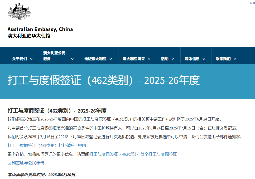 據(jù)澳大利亞駐華大使館最新消息:2025年澳洲打工度假簽證(462簽證)將于6月24日正式開啟預(yù)申請(qǐng)工作。