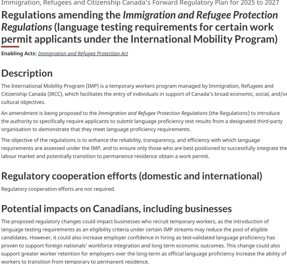 7月16日,IRCC發(fā)布了對國際流動計劃(IMP)部分工簽類別引入語言要求的修訂計劃,意味著——繼PGWP被要求語言成績之后,其他類型的工簽申請人,也逃不過語言門檻了!