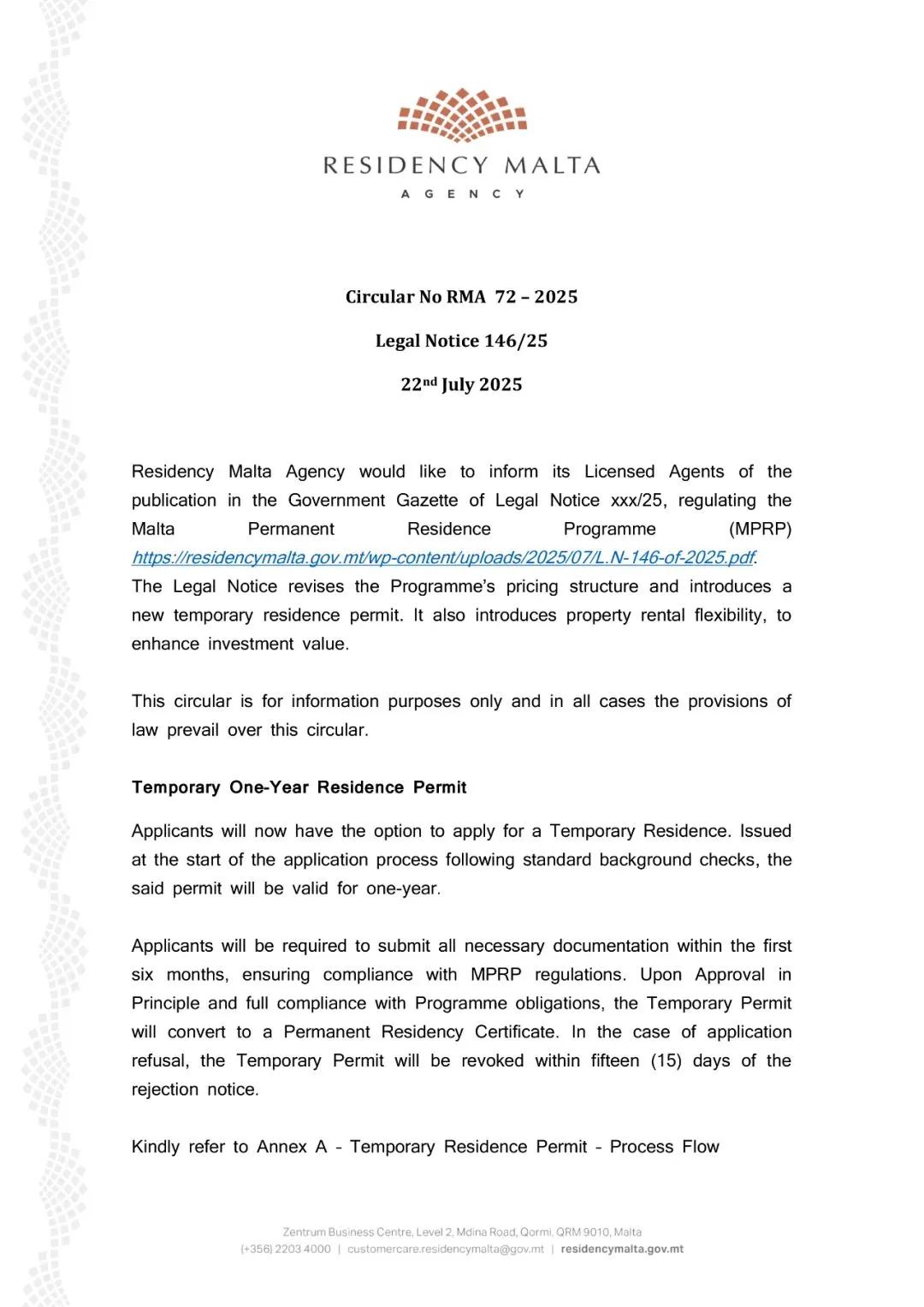 2025年7月22日,馬耳他政府正式發(fā)布第146號(hào)法律通知,對(duì)馬耳他yongjiu居留計(jì)劃(MPRP)進(jìn)行了多項(xiàng)關(guān)鍵修訂,包括費(fèi)用結(jié)構(gòu)、臨時(shí)居留許可、房產(chǎn)出租政策等。新政策適用于2025年1月1日起以后遞交的申請(qǐng)。