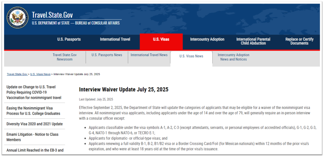 7月25日,美國(guó)國(guó)務(wù)院宣布,自2025年9月2日起,將大幅收緊非移民簽證的面談豁免政策!絕大多數(shù)非移民簽證申請(qǐng)者,包括首次申請(qǐng)者以及續(xù)簽者,均須親自到美國(guó)使領(lǐng)館進(jìn)行面談。這一改變意味著過(guò)去因疫情等因素而放寬的面談豁免政策將基本取消,申請(qǐng)流程將更加嚴(yán)格,簽證處理周期可能延長(zhǎng)。