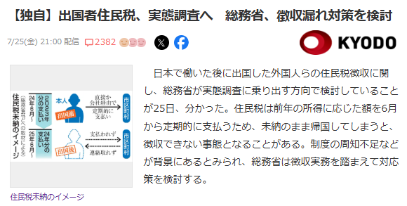 7月25日,日本總務(wù)省發(fā)布通知稱,將對(duì)曾在日本工作后出國(guó)的外國(guó)人可能存在的住民稅漏繳問(wèn)題展開(kāi)全面調(diào)查,并著手制定應(yīng)對(duì)策略。