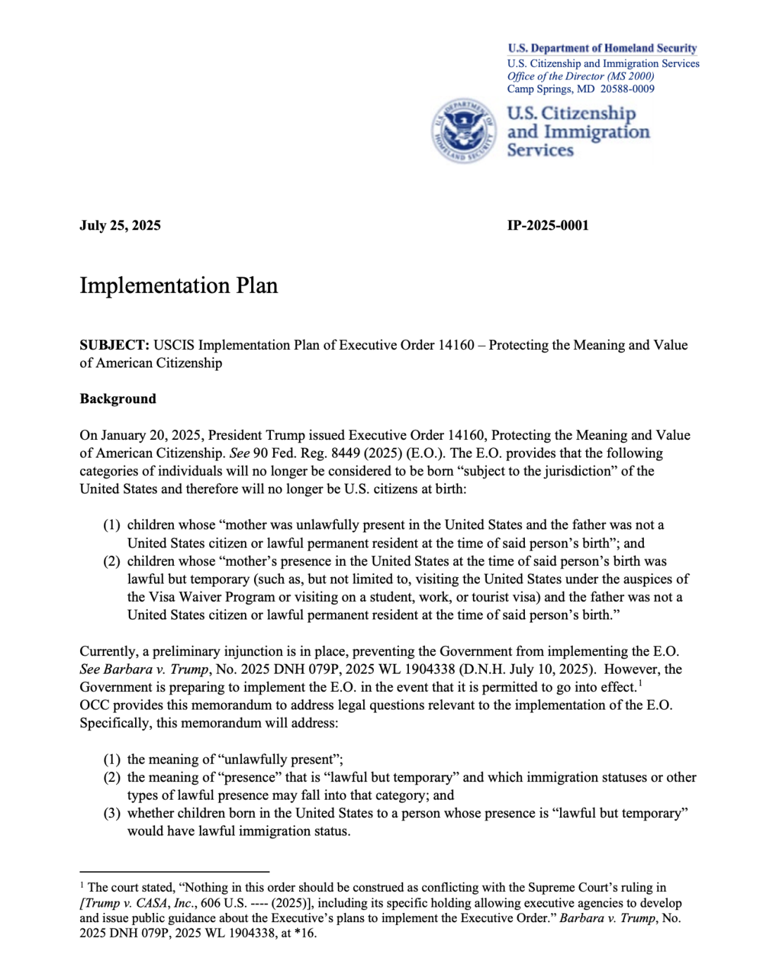盡管聯(lián)邦法院已對(duì)該命令發(fā)布初步禁令,暫緩其正式生效,但USCIS已于7月25日公布詳細(xì)的內(nèi)部執(zhí)行規(guī)劃,為未來法院若解禁政策鋪路。