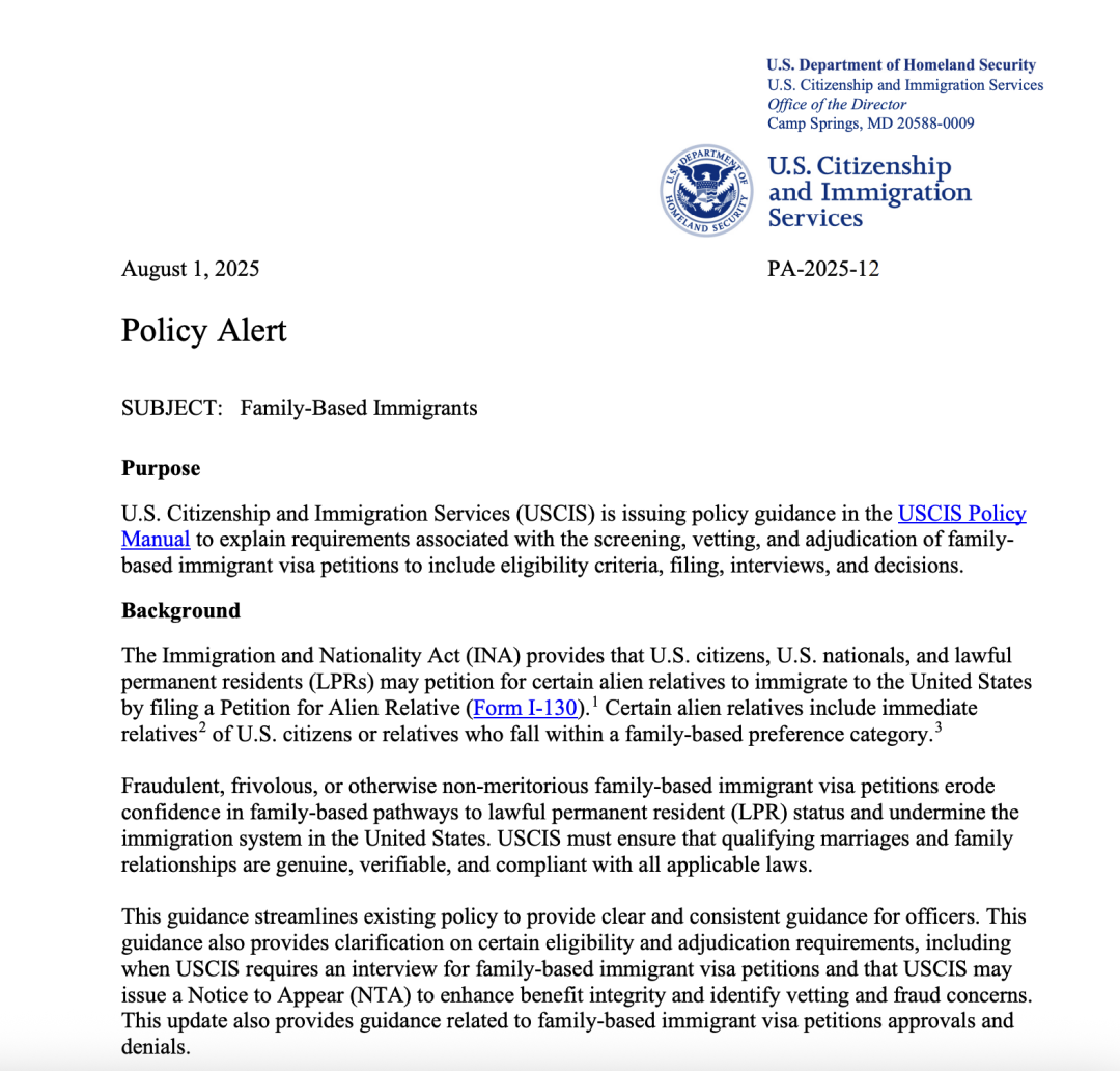 2025年8月1日,美國(guó)移民局(USCIS)正式更新其《移民政策手冊(cè)》,引發(fā)華人圈廣泛關(guān)注。此次更新涵蓋兩大關(guān)鍵內(nèi)容:親屬移民I-130申請(qǐng)流程改革加碼,難民/庇護(hù)類I-485申請(qǐng)面談門檻提高。