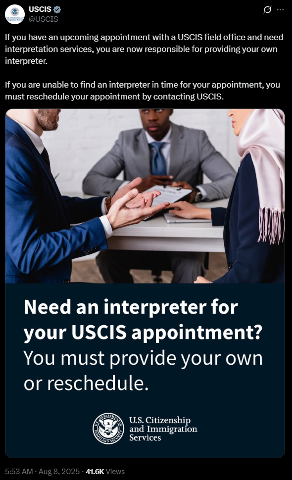 根據(jù)USCIS在社交平臺(tái)X上發(fā)布的公告,所有預(yù)約在USCIS現(xiàn)場辦公室進(jìn)行面談、但無法流利使用英語溝通的申請(qǐng)人,必須自行攜帶符合要求的合格口譯員。USCIS將不再提供官方翻譯服務(wù)。