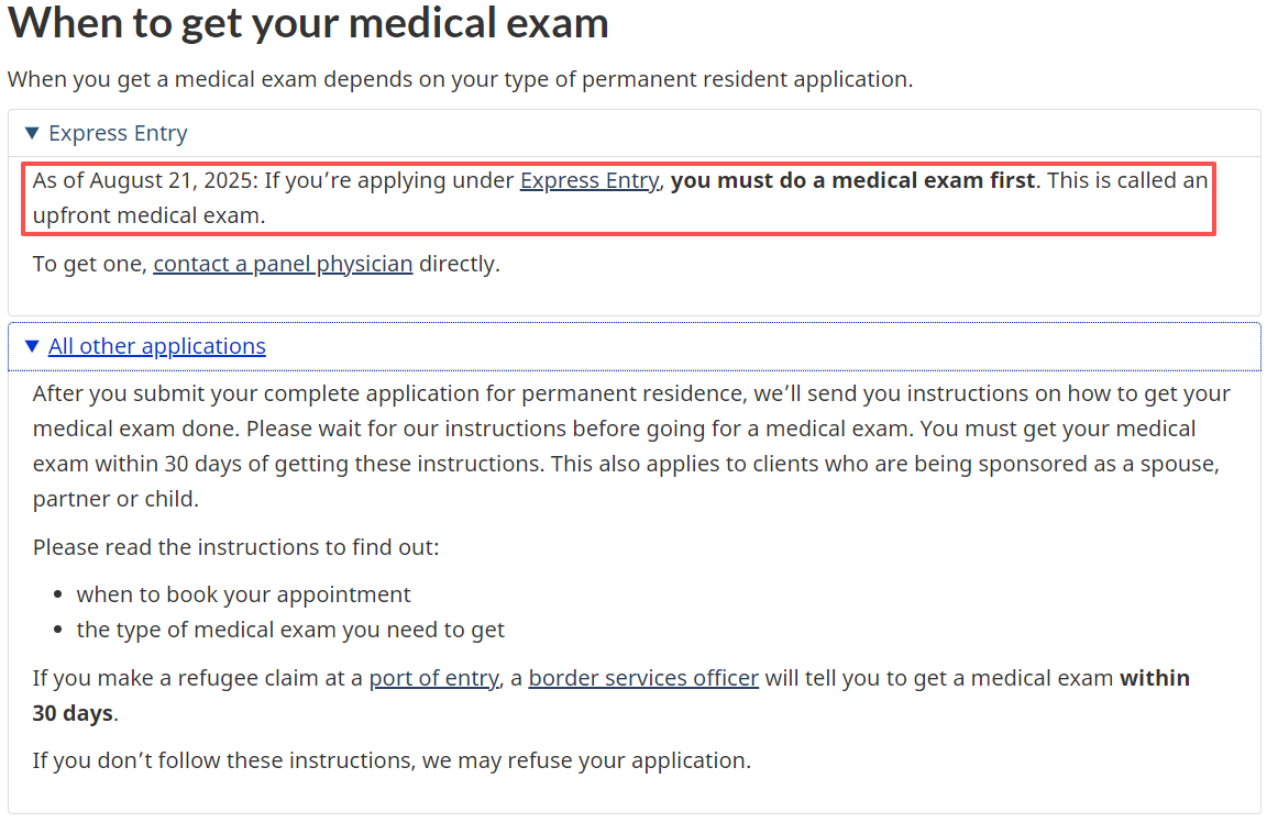 近日,加拿大移民、難民和公民部(IRCC)宣布,從2025年8月21日起,所有通過快速通道(Express Entry,簡稱EE)申請永久居民的人士,必須在遞交申請前完成預(yù)先體檢(Upfront Medical Exam)。未按要求完成體檢者,申請將無法進(jìn)入處理階段。