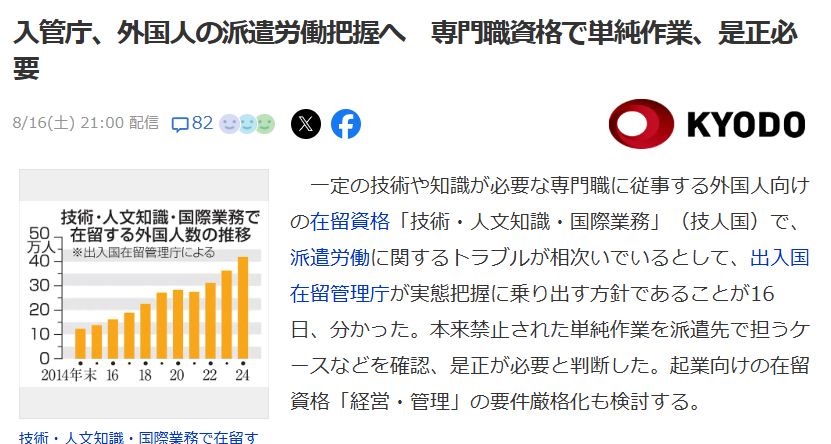 8月16日,日本出入國在留管理廳對外宣布,鑒于持有“技術(shù)?人文知識?國際業(yè)務”簽證(簡稱“技人國”簽證)的外國人在派遣勞動過程中糾紛頻發(fā),政府將開展實態(tài)調(diào)查。