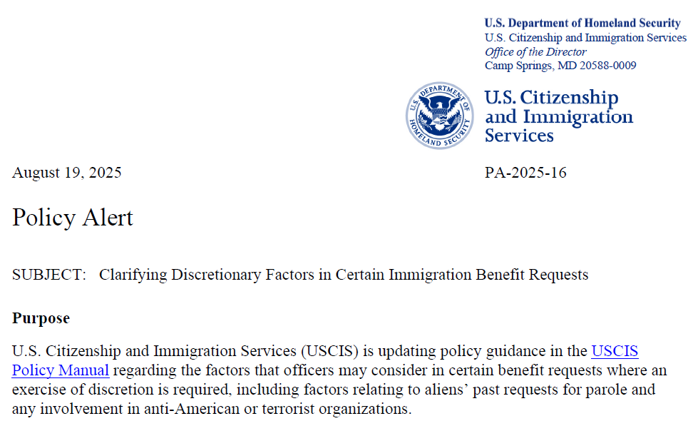 2025年8月19日,美國公民及移民服務(wù)局(USCIS)發(fā)布了一份新的政策警示,對涉及移民審案官“自由裁量權(quán)”的移民申請給出了更明確、更嚴(yán)格的指導(dǎo),甚至明確將反美主義和反猶太主義列為移民申請中的“壓倒性負(fù)面因素”。這意味著移民案件的獲批難度更大了。
