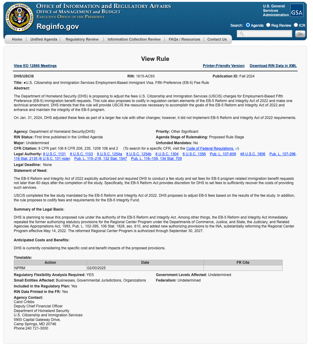 8月11日,美國行政管理和預算局(OMB)官網(wǎng)更新關鍵動態(tài): 美國公民及移民服務局(USCIS)基于就業(yè)的第五類優(yōu)先移民簽證(EB-5)費用規(guī)則” (RIN 1615-AC93) 狀態(tài)已更新為 “Pending Review”(待審查)。
