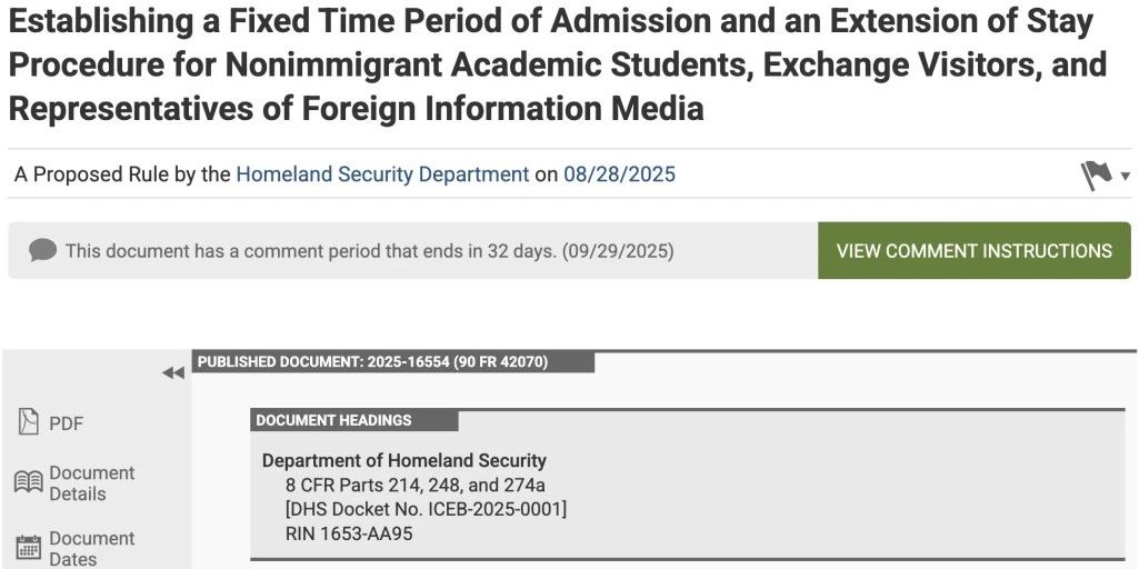 8月28日,美國(guó)國(guó)土安全部(DHS)在《聯(lián)邦公報(bào)》(Federal Register)上發(fā)布擬議新規(guī),計(jì)劃對(duì)國(guó)際學(xué)生(F類)、交流訪問(wèn)學(xué)者(J類)及媒體人員(I類)實(shí)行固定簽證期限。這被視為特朗普政府持續(xù)收緊移民政策的最新動(dòng)作。