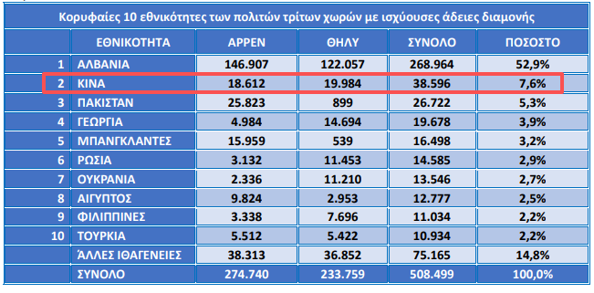 目前,持有希臘有效居留許可的中國(guó)籍公民共有38,596人。其中男性有18,612人,女性有19,984人,占在希臘的第三國(guó)公民的7.6%。