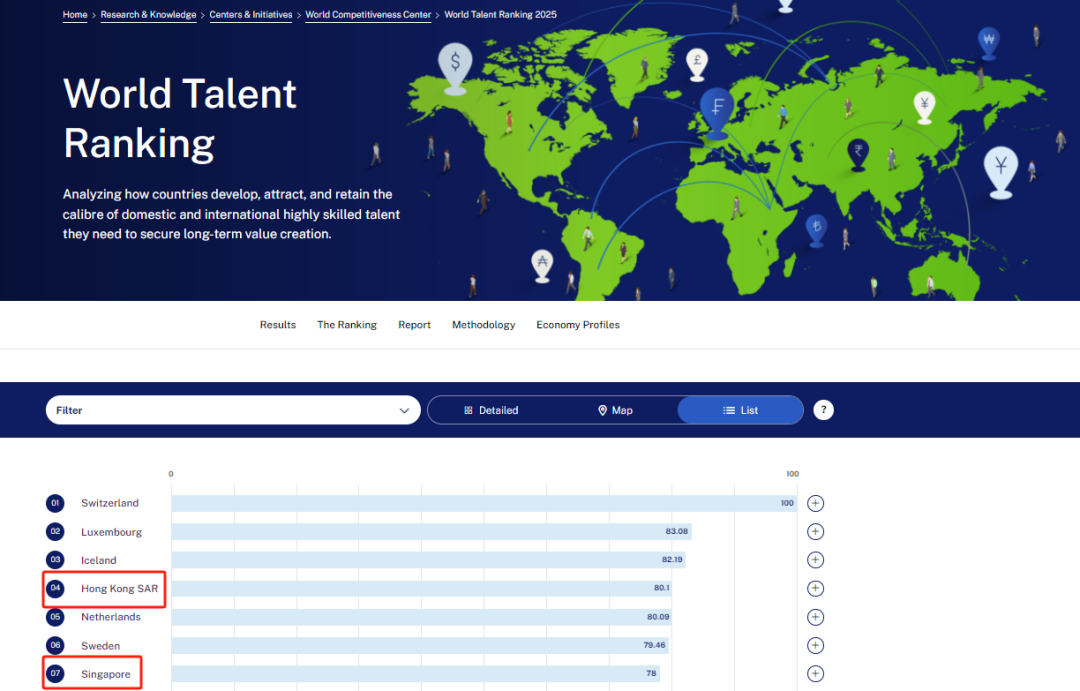 9月9日,瑞士洛桑國際管理發(fā)展學(xué)院(IMD)發(fā)布了《2025年世界人才排名》(World Talent Ranking 2025),中國香港由去年的第九位大幅躍升至第四位,榮登亞洲之冠,成為亞洲最具人才競(jìng)爭(zhēng)力的城市!