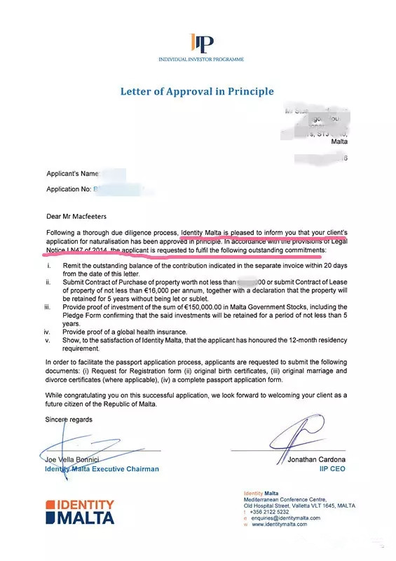 原則性批復是馬耳他移民局發(fā)給申請人的信,表明申請人的馬耳他國籍申請已經得到原則上的批復。接下來只要完成馬耳他申請條件中的三項投資,包括捐款,認購國債和購房/租房,就可以收到移民局下發(fā)的入籍邀請函,申請人就可以赴馬耳他宣誓領取護照啦!