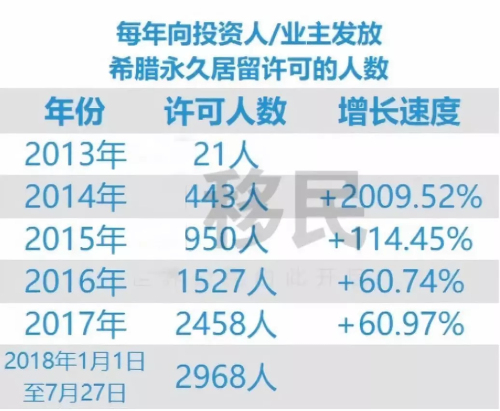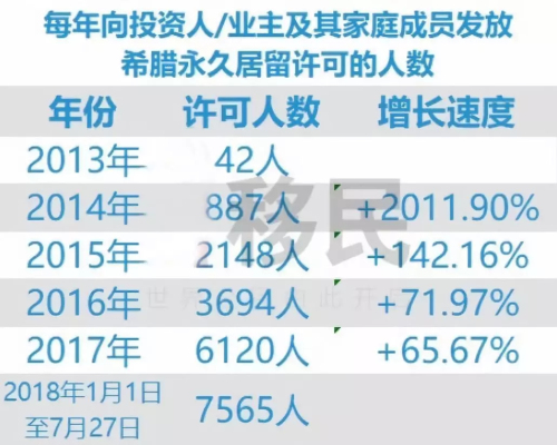 根據(jù)希臘移民政策部(Ministry for Migration Policy)最新數(shù)據(jù),2018年1月1日到7月27日之間,希臘移民部門已經(jīng)發(fā)放希臘永久居留許可主卡2968張。此外,2013年至2018年,來自全球的申請人數(shù)及其申請人的家庭成員人數(shù)都是逐年激增。