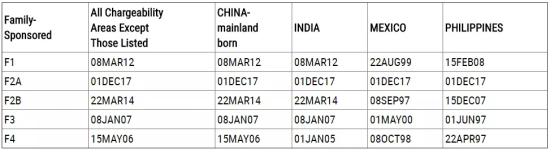 根據(jù)親屬移民排期表A,對(duì)于中國(guó)大陸出生的申請(qǐng)人來說: