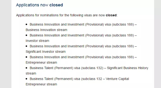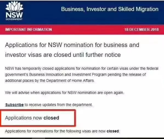 12月18日下午,澳洲新南威爾士州政府通知,暫停所有商業(yè)移民申請;包括188A創(chuàng)業(yè)投資類,188B投資類,188C重大投資者類,和132天才企業(yè)家類移民簽證州擔(dān)保申請,政府會進一步通知何時將再次開放申請。維多利亞州,昆士蘭州,南澳州,西澳州,塔斯馬尼亞州可以繼續(xù)申請,最新消息,洲際海外會再持續(xù)更新。