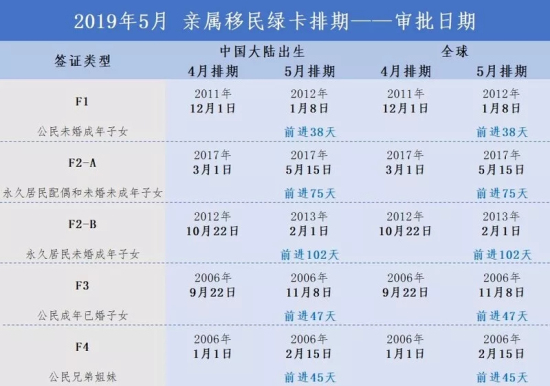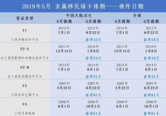 美國國務(wù)院公布2019年5月移民排期,親屬移民類(中國大陸及港澳臺(tái)出生申請(qǐng)人)所有類別都同步前進(jìn)1個(gè)月到3個(gè)多月不等。其中第二優(yōu)先進(jìn)展最快,永久居民的未成年子女(F-2A類)前進(jìn)2個(gè)半月(到2017年5月15日)、成年未婚子女(F−2B類)也再次前進(jìn)3個(gè)多月。