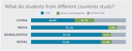 也就說(shuō),有越來(lái)越多的中國(guó)留學(xué)生更傾向于STEM專業(yè)而不是商科類專業(yè)。