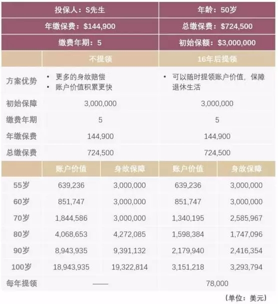 S 先生,50 歲,健康非吸煙。是一位企業(yè)主,考慮到日后退休后能夠有更多的資 金去做自己感興趣的事情,選擇了回報(bào)更高的美國人壽保險(xiǎn)。