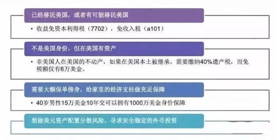 CRS讓很多人“談虎色變”。對(duì)于在海外有高額資產(chǎn)的朋友們來說,一個(gè)可選的方法就是把資產(chǎn)轉(zhuǎn)移到不在CRS交換國的國家,比如美國。美國的投資產(chǎn)品非常多樣化,保險(xiǎn)作為金融產(chǎn),來說配置是最為簡(jiǎn)單,既有了高保障,同時(shí)又具備高杠桿和高收益的功能,財(cái)富不但不會(huì)縮水,而是會(huì)大大的增值。