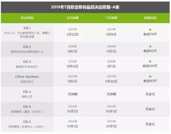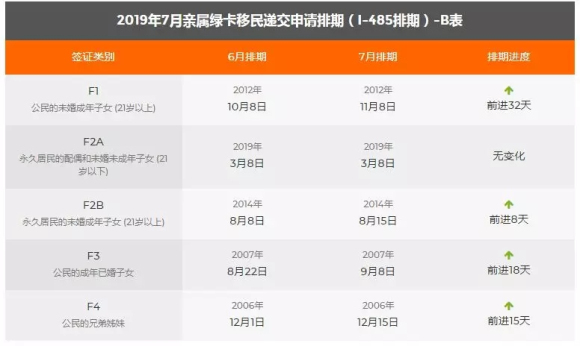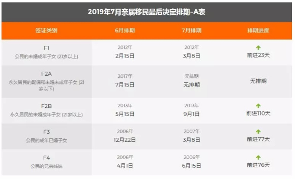 今天美國國務(wù)院公布了2019年7月各類移民排期表,這個(gè)月親屬移民和排期移民都有大幅前進(jìn),下面和小編一起來看看吧!