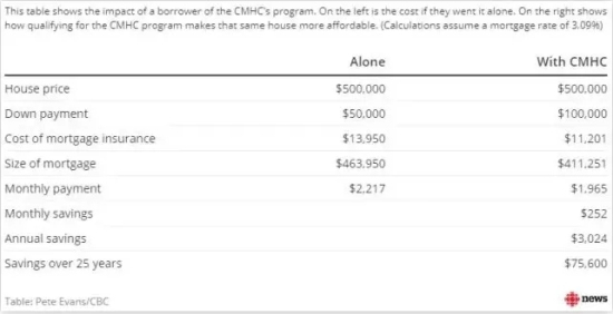 如果以一間$400,000的新房為例,可以看到有了CMHC的補(bǔ)貼之后,買房者每個(gè)月可以節(jié)省$252加元,每年可以節(jié)省$3024加元,25年的貸款時(shí)間下來總共可以節(jié)省$75600!