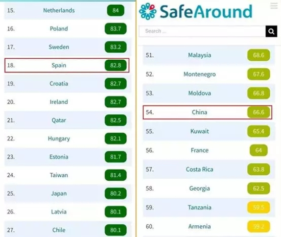 這里的環(huán)境安全不僅包括治安安全,還包括交通安全以及沒有恐怖襲擊和戰(zhàn)爭等各種威脅。根據(jù)國際安全水平評估網(wǎng)站Safearound發(fā)布的2019年數(shù)據(jù),西班牙位列全球最安全國家第18位,而中國僅排名54名。
