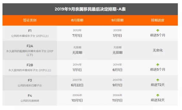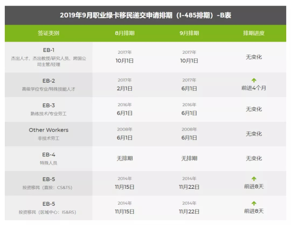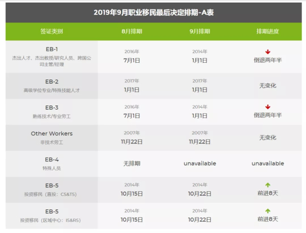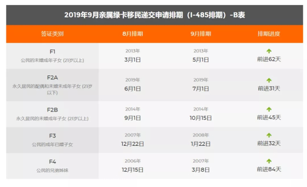 國務(wù)院公布的2019年9月綠卡移民排期公布,親屬移民穩(wěn)步前進,職業(yè)移民 EB1 和 EB3 均出現(xiàn)大倒退,EB2 停滯不前。以下是幾個重點: