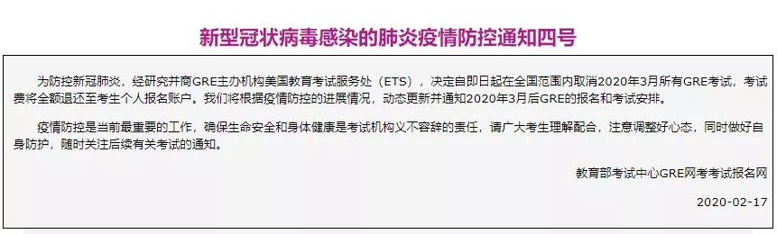 同一天,同屬于ETS的美國研究生入學考試(GRE)也宣布取消3月份所有考試。